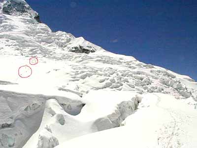 下段プラトーより雪原を登降中のメンバー。左上し上部セラック帯の出口付近まで進む。
