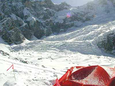 これから3日間、全員休養して3ケのラダーを上げた後の2日間ぐらいで、C1を作りたいと思います。 C1(5600m〜5700m)ここからのルートは下部に岩が出ており、リッジ右側の上部、アイスビルディングも不気味ですが、阪大隊の写真と同じ形、大きさのようです。