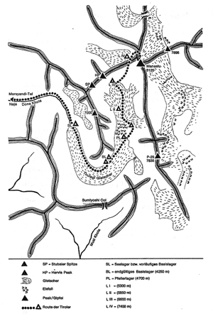 日本人の名前が地名に?、外国人によるネパール・ヒマラヤ報告書の概念図に載った唯一の地名である。その昔、モリモト・ピークもあったけど外国人に概念図が書かれたかどうか知らない。R・メスナーは先人を尊び、概念図にSumiyoshi Col.とチャーンと書いてます。良く勉強してるねえー。両岳人には、もちろんソンケーしますわ! 「老師!!」ボクンらの報告にはローシ・コルと格上げして報告します。 |