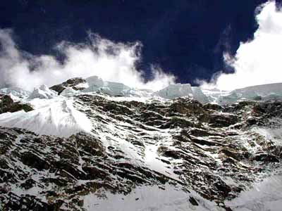 ルートはRC(5000m)より、アイスフォールを廻りこみ、左端の稜にルートを見出すつもりです。 |